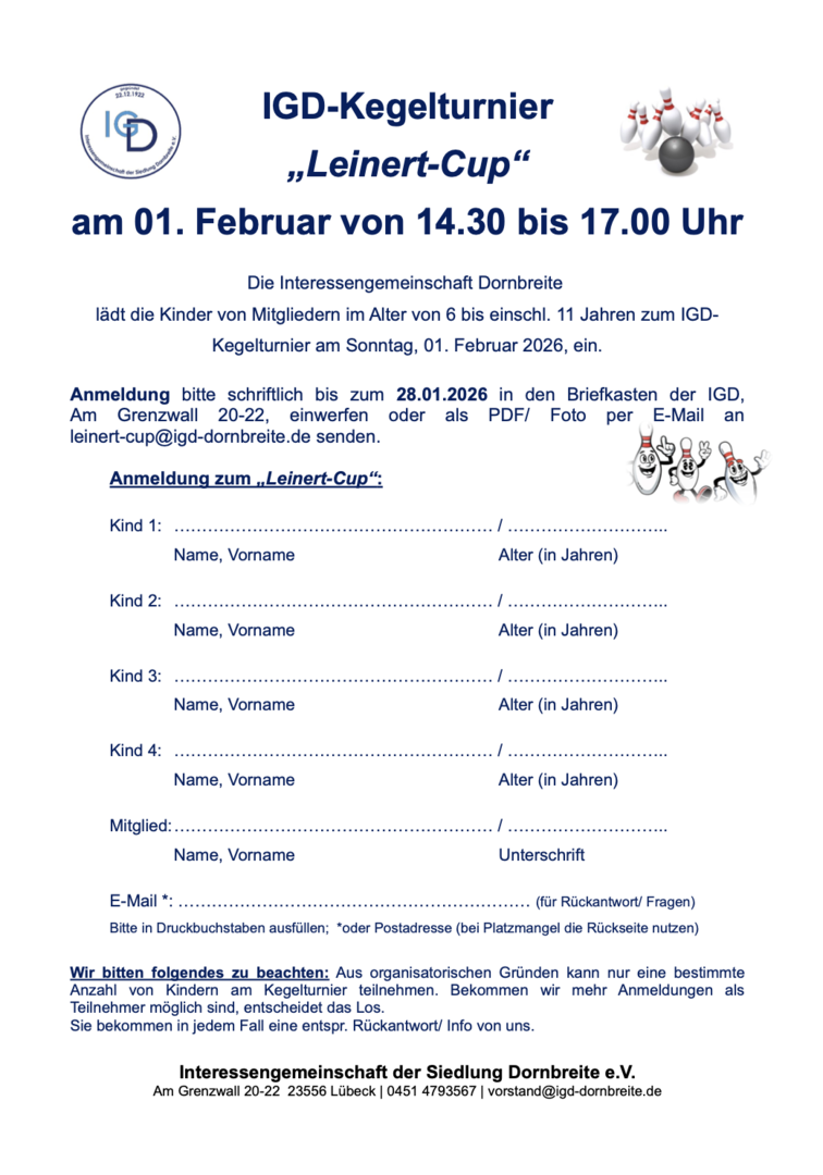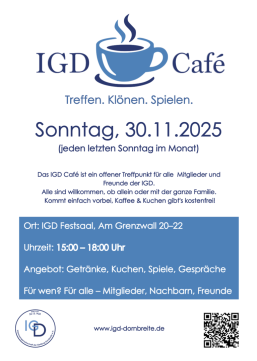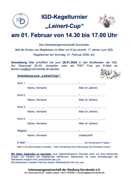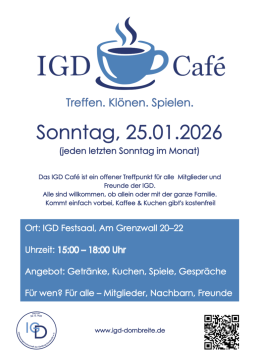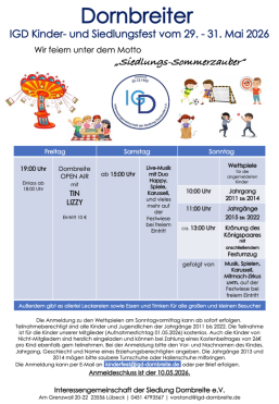Wir, die Interessengemeinschaft der Siedlung Dornbreite e.V., kurz IGD, sind ein Zusammenschluss vieler unterschiedlichster Bewohner der Siedlung Dornbreite in Lübeck, die sich für ein starkes Miteinander und die Gemeinschaft innerhalb der Siedlung und über deren Grenzen hinweg einsetzen.